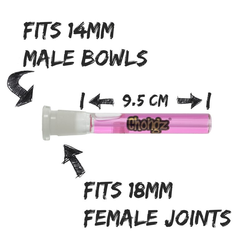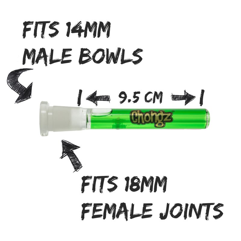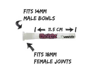 The Chongz 18.8mm to 14.5mm Diffuser Stem with jewels will fit any bong with a female 18.8mm joint and will take any bowl with a male 14.5mm connection.
