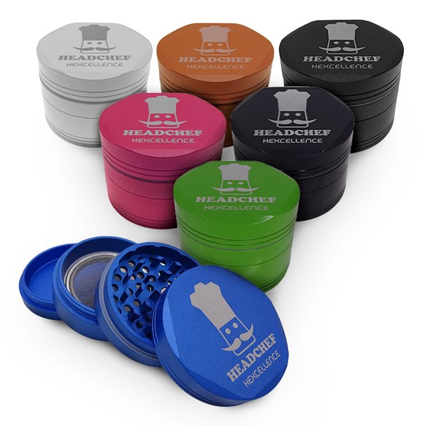 The excellent NEW herb grinder from Headchef, the Hexellence Hardcore Non-Stick 62mm 4 part metal herb grinder.